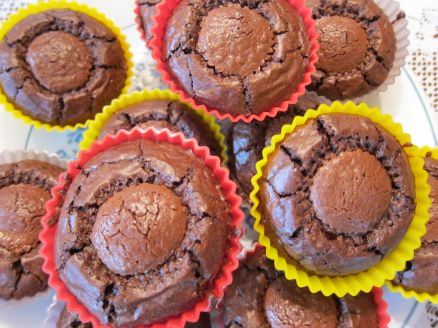 Heat oven to 350F. Line 12 muffin pan with paper cups. In a large bowl, combine ingredients and beat 50 strokes with a spoon. Fill muffin cups 2/3 full. Press 1 peanut butter cup in center of batter until the edge of candy is even with the top of the batter. Bake for 25 to 35 minutes. Cool.