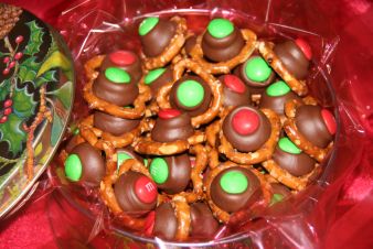 Place pretzels on a cookie sheet lined with parchment paper. Top each pretzel with a kiss. Melt kisses onto the mini pretzel twists at 275F. for 3 minutes. Remove from oven and immediately press a single M&M on each kiss. Refrigerate.