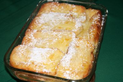 In the morning, preheat oven to 350F. Bake for 30 to 35 minutes, or until puffed and set. Dust with powdered sugar.