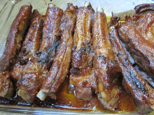 Place ribs in a greased 13 x 9 x 2-inch pan. Combine remaining ingredients; pour half over ribs. Bake, uncovered at 325F. for 1-1/2 hours or until meat is tender, basting often with the remaining sauce.