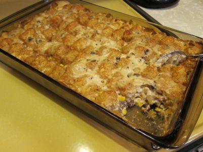 Brown ground beef, onion and green pepper until partly done; drain. Place in 13 x 9 x 2-inch casserole dish. Add corn. Place tater tots in rows over corn and ground beef mixture. Mix soup and evaporated milk in small bowl. Pour over casserole. Bake at 350F. for 1-1/4 hours.