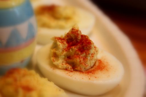 Cut peeled eggs lengthwise in half. Slip out yolks; mash with fork. Mix in seasonings and mayonnaise. Fill whites with egg yolk mixture, heaping it up lightly.